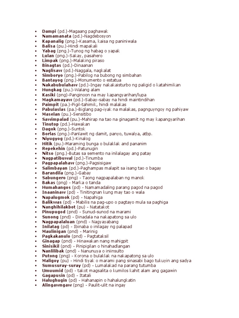 Sa paksang ito tatalakayin natin ang mga halibmwa ng mga malalim na salitang Filipino at ang kanilang mga kahulugan. Nakatanggap ng mga masasakit na pag-uuyampinag sabihan siya ng negatibong salita mula sa mga kamag aral nito tuwing nagsisimba ay may dala si Maria na isang tela na kulay dilaw na may desinyong bulaklakin napaka ikli nito at napakalambot hawakan halos lahat ay gusting hingiin iyon dahil sa ganda ng kanyang Borlas. MyMemory Worlds Largest Translation Memory.