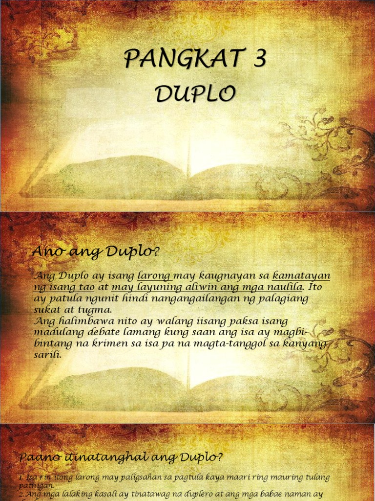 Kahulugan ng karagatan at duplo 2 See answers sa sa itinuturing na matandang anyo ng panitikan ang karagatan at duplo Tinatawag itong tulang padulasapagkat ang mga ito ay nasusulat nang patula at ginagampanan ng mga tauhan. Binatay nila ang anyo sa mas naunang mga uri ng pagtatalo na gumagamit din ng elemento ng tula katulad ng karagatan huwego de prenda at duplo. Labanan ito ng pagalingan sa pagbigkas at pagbibigay katwiran nang patula.