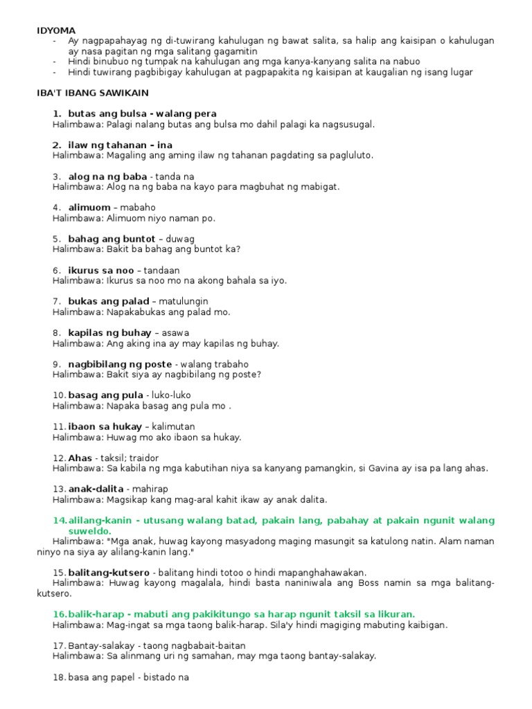 Ang isang sawikain o idyoma ay isang pagpapahayag na ang kahulugan ay hindi komposisyunal sa ibang salita hindi binubuo ng tumpak na kahulugan ang mga kanya-kanyang salita na nabuo. Butas ang bulsa - walang pera 2. Saklaw nito ang pagpapahayag ng mga Naku.